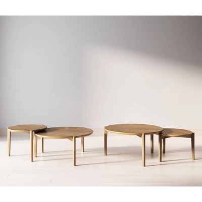 Meet Kendall, a 2-piece coffee table with a beautiful wire-brushed finish that will complement your mid-century modern home. This nesting coffee table set includes a smaller piece and a larger table that you can stack interchangeably — yes, you can place the smaller table above the larger table, or vice-versa! You can also use them separately as round cocktail tables or accent end tables in your living room.