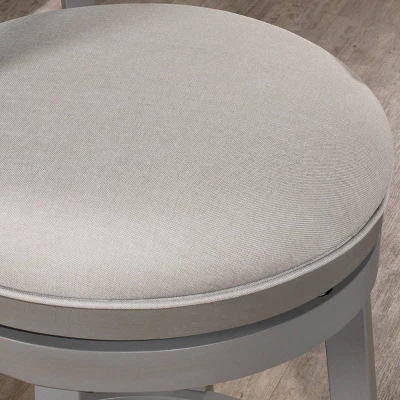 - The round 360 degree swivel seat is upholstered in a fog gray fabric