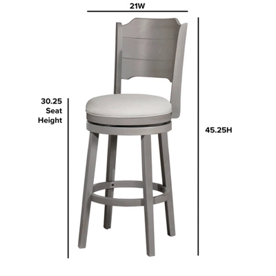 Delightfully charming, the Hillsdale Furniture Clarion Swivel Bar Height Stool is right at home with any decor from coastal to farmhouse theme. Its Distressed Gray wood finish and ship slat back recall country fence line and shutters. The Fog Gray upholstery furthers the calming motif. Its high back and 360° swivel seat, with a perfectly placed footrest, make this bar height stool a stylish and comfortable addition to your bar height dining table or kitchen island. Assembly required.