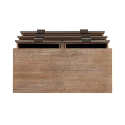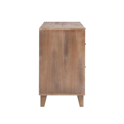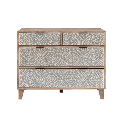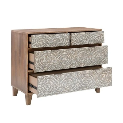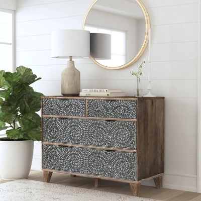 Whimsical and brimming with rustic charm, this 4-drawer console is brought to you straight from the scene of a boho fairytale. Beautiful mother of pearl inlays line the fronts of two small top drawers and the two larger drawers on the bottom. The wooden frame is finished with a glaze that lends itself to a worn, vintage look that fits seamlessly in contemporary settings. Metal handles and drawer glides offer ease of use, rounding out this handy, stylish piece.