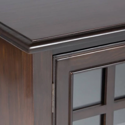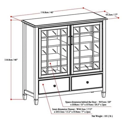 - Features 2 tempered glass doors that open to a cabinet with 4 adjustable shelves and 2 deep drawers.