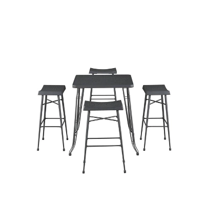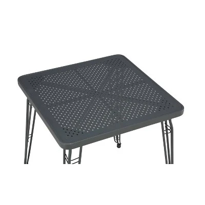 Full of industrial edge, the Gilbert 5-Piece Pub Set manages to maintain an air of coziness. This compact 5-piece pub set easily seats four people for dinner or drinks. Curved seats and built-in footrests provide comfort and stability for you and your guests. Crafted from 100% steel, the set is decorated with perforated stars dotting the seat and tabletop. Floor glides on the metal feet protect against damage to your floors. Also available in a 3-Piece Set. Ships ready to assemble with all hardware included.