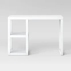 - Features open shelves and drawer
