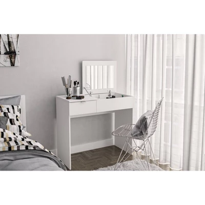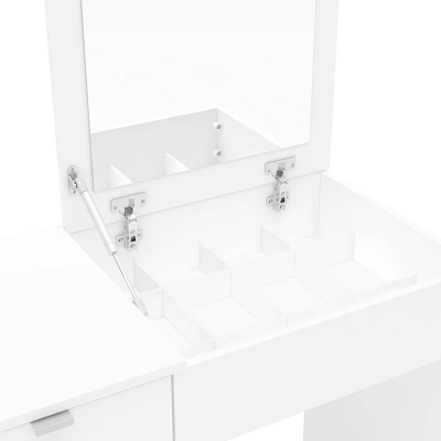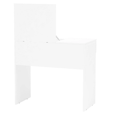 The Pull Top Vanity is a perfect addition to any room. This vanity has plenty of storage for all your make-up and any other products you have in your room. The table top opens to an enclosed storage space and mirror. This vanity also includes a drawer on metal glides. The versatile design allows this piece to be used as both vanity and writing desk when the top is closed. With the modern design and amble work space, this vanity will go great in any room.