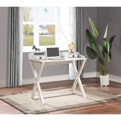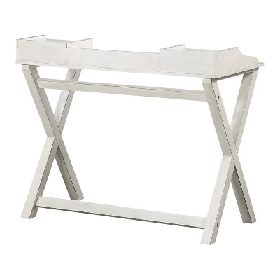 The perfect place to catch up on emails, pay bills, or just jot down a quick list, the Barton Writing desk anchors your office space or family command center. Lovely features like, contoured low rise hutch with gallery rail, and the X-frame trestle base create a striking silhouette. The two drawers with rustic iron pulls keep your supplies tidy. Built with beautiful and durable birch veneer, this desk is quick and easy to put together with a simple 8-bolt assembly.