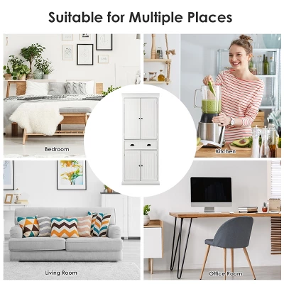 Are you finding a storage cabinet to make full use of space of your room? Our practical storage cabinet with large space can help you solve this problem. Not only can the cabinet be placed in kitchen as a cupboard, but also it is ideal to be a normal cabinet in your bedroom, living room and hallway to add a functional storage option. The storage cabinet has two double-door cabinets and one large center drawer which will provide spacious space for your items such as dishes, books and bottles. And four shelves come with the cabinet that all can be detached or adjusted in three positions. Made of premium density board, the cabinet is sturdy and durable foe long time using. In addition, the door is equipped with magnetic button to prevent items from falling and round handle for opening and closing easily. Its stylish design makes this cabinet match well with any other home furniture or decors.