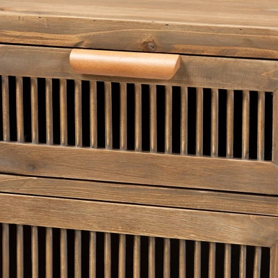 Rustic tones and clean lines make the Clement end table a handsome addition to any space. This sturdy wood end table displays a medium oak finish that highlights the wood grains for a cozy, rustic look. One compartment, behind a door, and two drawers provide ample space to store a variety of household essentials. Spindle detailing lends visual interest, while cut-out handles lend a modern touch. The Clement end table is made in China and will arrive fully assembled. Dimensions: 27.95″ high x 18.5″ wide x 13.78″ deep; Drawer dimensions: 5.51″ high x 15.94″ wide x 11.81″ deep; Legs: 3.94″ high; Inner shelf: 14.96″ high x 17.72″ wide x 12.6″ deep;