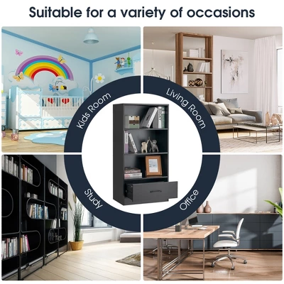 Are you looking for a piece of furniture with storage function for your home? Then this 4-tier storage shelf will satisfy your needs! Three large storage shelves and a drawer for personal items can meet all your daily storage needs. Quality MDF and strong connections provide excellent load-bearing capacity. What’s more, the reliable anti-toppling device can also protect the storage rack from tipping over. You can use this storage shelf in different places, such as office, living room or study.
