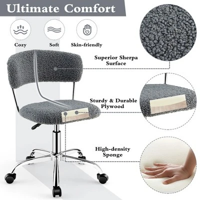 Enjoy your leisure time or working hours with this Faux Fur swivel chair! It creates a cozy space with the furry Faux Fur cover and thick sponge padding, giving you the optimal comfort. Besides, the built-in plywood board and sturdy galvanized steel frame ensure a reliable support for different users. And users of different heights can find the ideal position thanks to the adjustable seat design. Sitting on the computer desk chair, you can swivel by 360 degrees and easily go anywhere you like, as the rolling casters allow flexible movement. With all these features, you can use this armless chair as a computer desk chair, a vanity chair or a leisure chair, and enjoy it in different rooms.