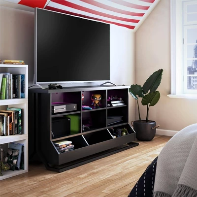 Break out all your favorite gaming systems and components and proudly display them on the NTense Grind Gaming Console & TV Stand with LED Light Kit. Perfect for the bedroom, living room or family game room, this impressive TV Stand can hold most flat-screen TVs up to 65” wide or up to 120 lbs. The TV stand features six individual shelves with extensive wire management in back, and ultra-cool LED lights out front to illuminate all your Xbox, PlayStation and Nintendo systems. Constructed from durable painted MDF, the matte black finish pairs with the LED lights for a contemporary look that will fit right in with any true gamer’s space. Tuck away extra controllers, games and cords in the three storage bins below for easy access. The Gaming Console & TV Stand ships flat to your door and requires assembly upon opening. Two adults are recommended to assemble. Once assembled, the TV Stand measures to be 29.1” H x 58” W x 20” D.