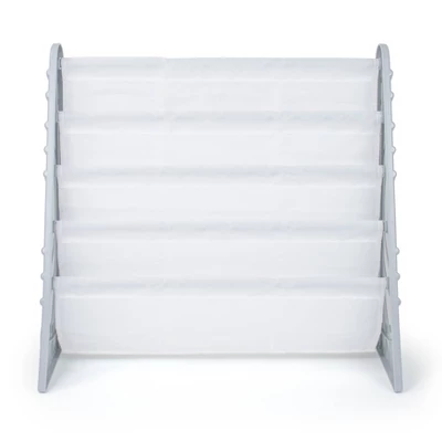 The space saving, toddler sized Humble Crew Kids Bookshelf 4 Tier Book Organizer is the perfect storage solution for your little one’s favorite collection of books. Plastic children’s bookcase displays books with covers facing forward for easy identification. Bookrack features four deep fabric storage pockets for reading books, board books, coloring books and magazines of all shapes and sizes. Sturdy yet lightweight plastic construction is easy to assemble and clean. Space saving bookshelf is sized just right for your toddler and is ideal for children aged 3 and up. Assembled dimensions: 25.5″ W x 10.8″ D x 23.6″ H