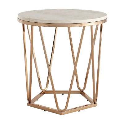 Bring glam style to your small space with the Aiden Lane Laconia Faux Stone Round End Table. A metal base adds a unique geometric look, while a round, faux stone tabletop easily holds your glass of wine and your favorite book. Slide this two-tone side table alongside your living room sofa to hold a table lamp and the TV remote, or tuck between a pair of armchairs to put the finishing touch on your sitting room design. Maximize your modern décor with this faux stone accent table.