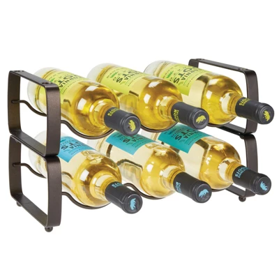 Organize and show off your wine collection with the Countertop Wine Rack Organizer by mDesign. Each rack holds up to 3 bottles of your favorite wine or bottled drink. The stackable design lets you create vertical, space-saving storage on kitchen counters for instant access or in the fridge for perfectly chilled drinks. Curved compartments keep each bottle separate and organized, while the open tops make it easy to grab a bottle right when you need it. Each wine rack features decorative balled feet that elevate stored items from tabletop and counter surfaces to keep them dust free. The feet also nest inside each corner of other racks to help them stay firmly in place when stacked.