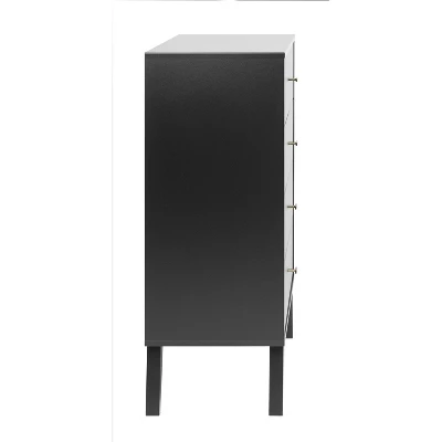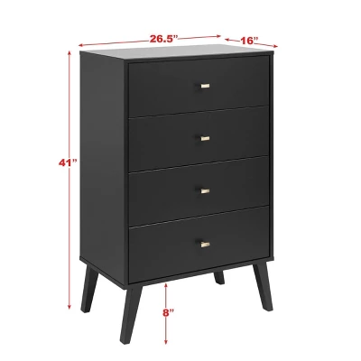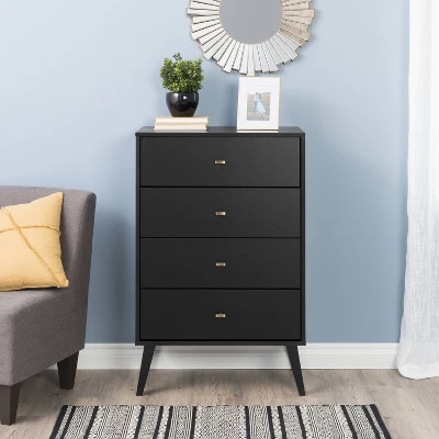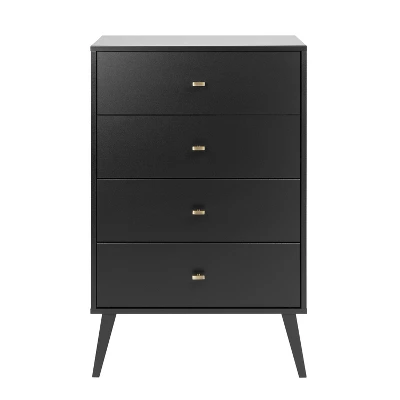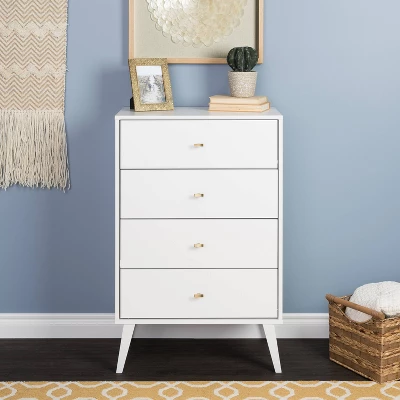 The Prepac Milo 4 drawer dresser is a modern take on a retro look, with a sleek mid-century modern design that adds a touch of vintage styling to your bedroom. Four drawers run smoothly on metal glides, offering easy access to storage for clothing and bedroom items, all in a compact footprint for any bedroom size. The tapered solid wood legs and inset drawers deliver a clean and modern look to your bedroom. Brushed brass finished knobs add to the retro-chic design of this functional and fashionable dresser. Style this dresser on its own, or combine it with any of the products in the Milo collection for a timeless look. Constructed from non-toxic, CARB-2 compliant, laminated composite woods. Ships Ready to Assemble, includes an instruction booklet for easy assembly and has a 5-year manufacturer’s limited parts warranty. Manufactured in Canada and meets all North American safety standards.