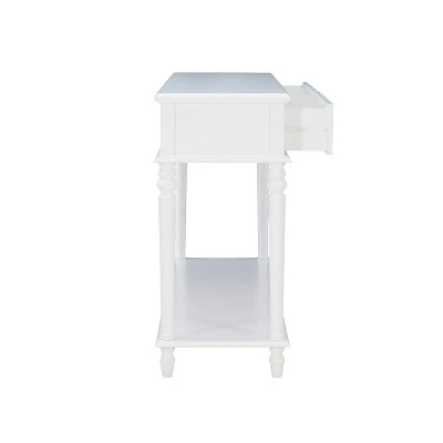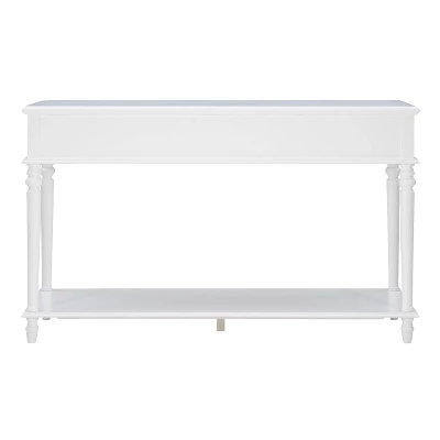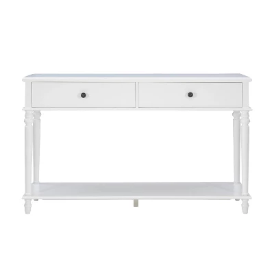 Classic design in a brilliant white color with traditional features, this stylish console table will not only render a fresh appeal to the space you placed it, but also bring an iconic design style to your whole room. This rectangular console table can decorate your entryway, foyer, hallway, living room or your office space, bringing function to your living area without taking up too much space. Between the 2 smooth gliding drawers and upper and lower surfaces, this console offers essential storage space to place ornaments, baskets, small electronics, containers and more.