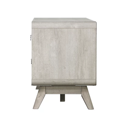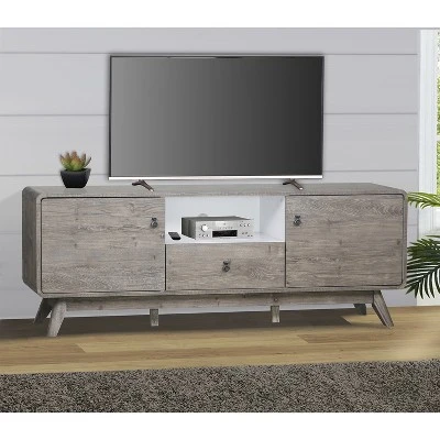 - Mid-century modern two-door TV stand offers attractive, stylish storage in the living room