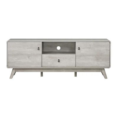 Play up vintage charm in your contemporary living room with this spacious TV stand. Its rounded case adds soft, mid-century flair while a splayed leg base draws the eye and adds movement. The stand boasts ample storage, complete with two roomy compartments and one drawer, perfect for everything from media to gaming accessories. One shelf is ideal for media players and game stations, offering a round cord management opening to keep everything tidy. Modern hardware adds a hint of charm to the look, a perfect finishing touch in an inviting family space. The wide top easily hosts a flat-panel television, or is great for display beneath a wall mounted TV.Saint Birch’s mission is to help everyone create a better home, where one can find affordable style and comfort. We strive to ensure every customer’s experience with our products is warm, worry-free, and comfortable.