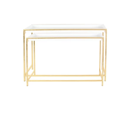 - •These rectangle nesting tables feature solid white tabletops and gold metal frames