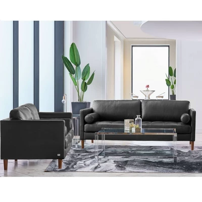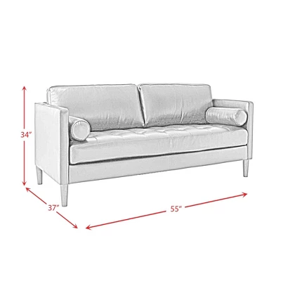 The Picket House Furnishings Sire Loveseat is a sleek addition for your office, living room, and more. Upholstered in rich leather with wooden tapered legs. Piped seams add a touch of Sophiscation. Constructed of solid wood and plywood. Includes two bolster pillows for décor. Perfect for small spaces, add the Picket House Furnishings Sire Loveseat to your home for a modern flair.