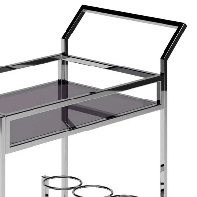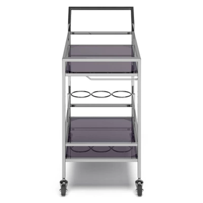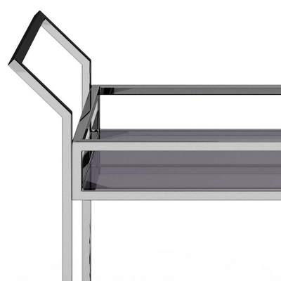 Sleek and glamorous Snell Bar Cart is at your service. The cart’s stainless-steel chrome frame rolls about on a set of four wheels, serving food and drink with style. Featuring a top and bottom shelf that is made of grey smoked tempered glass and plenty of storage for wine bottles and stemware. This beautiful and well-crafted cart is perfect for your entertaining and storage needs.