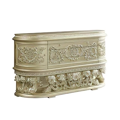 The Vatican Bedroom Collection employs a sense of timeless style in each piece, from button-tufted upholstery, scrolled floral accents to detailed design. Padded headboard and footboard showcase classic arched-silhouettes that are graced with crown, scrolled trims, and ornate engravings. Champagne gold-tone lends a sleek finishing touch to matching case goods. The Vatican Collection will infuse your bedroom with glitter and endless luxury.