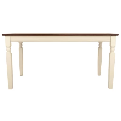 Incorporate cottage-cool warmth in your dining space with the Whitesburg dining room table. A two-tone finish serves up twice the charm and character. Made with select veneers and hardwood solids in a two-tone finish. Table is finished in a burnished brown color. The table base is finished in cottage white paint. Signature Design by Ashley is a registered trademark of Ashley Furniture Industries, Inc.