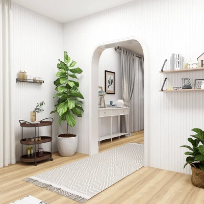 A versatile piece ideal for storage or decorative display in any space. Looks stylish in your living room or kitchen as a serving tray or as a decor stand. Decorate this rolling bar cart to store wine necessities or as side table to store your books, sculpture and potted plants for a creative display. This item ships in 1 carton. Suitable for indoor use only. This item ships fully assembled in one piece. Maximum weight limit is 30 lbs. This is a single brown colored serving cart. Pine bar cart features 3 shelves. Traditional style.