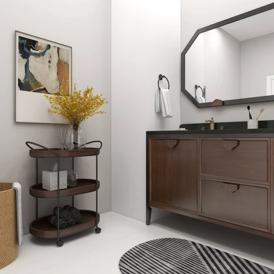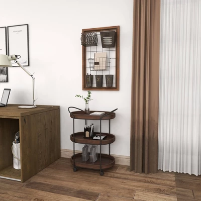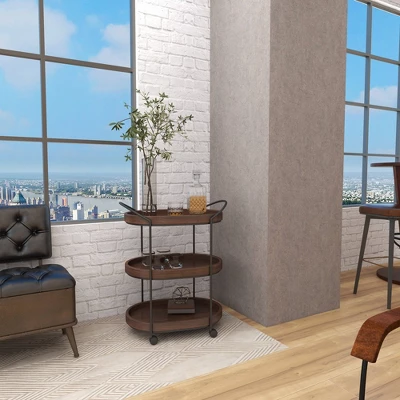 - •Dark brown rolling bar cart carries an oval tray shelves in a 3-tiered structure with curved handle bars on each side and supported by smooth caster wheels for optimal storage