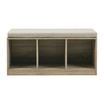 Make any space stylish and functional with the versatile Zeus Cube Organizer Storage Bench with Cushion. This storage bench features a gray upholstered seat with 3 built-in cubbies that provide ample storage space and a chic look. Crafted with durable and tough engineered wood, the multipurpose design makes this accent storage bench great for entryways. Simple assembly is required and tools are included.